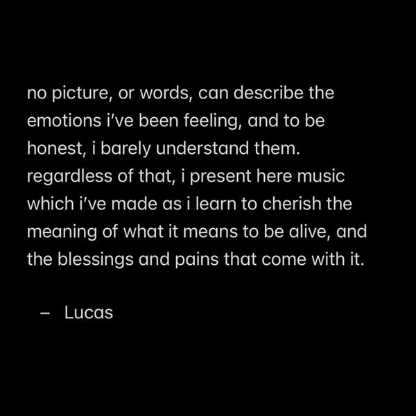 Hey! Lucas here, I'm gonna make this website cooler, so sorry if it looks a bit barebones, and I wanted to put a link to find all my music on streaming, but for some goddamn reason, feature.fm costs money to use?!!!!! Insane shit, but regardless of that, just look up my name on streaming services, you'll find it thereOR ALTERNATIVELYYou can get the music at whatever price you want, or TOTALLY FOR FREE, at the Bandcamp link below!Anyway, I'll make this site cool, but for now, please pardon my dust!- Lucas